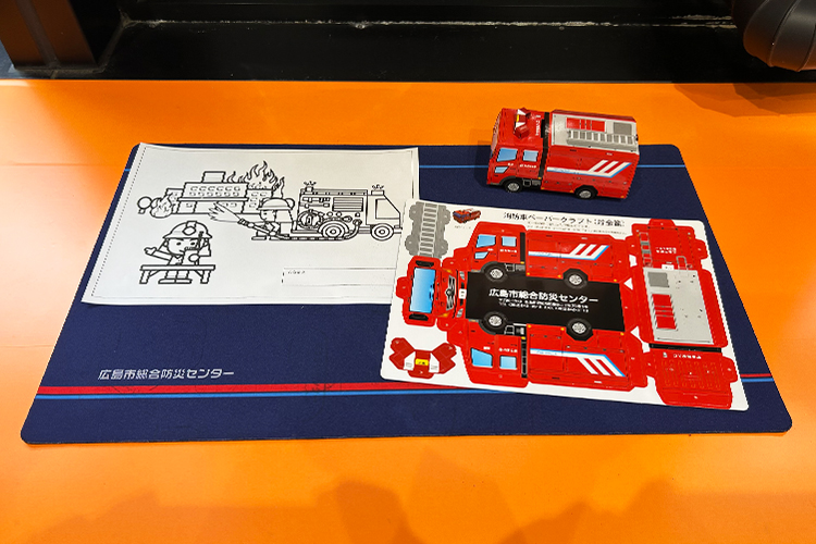 ペーパークラフトの消防車、スタンプ、塗り絵などご用意しております。